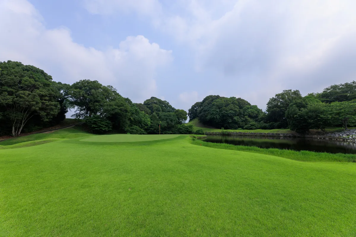 コースの右側とグリーン奥が美しい池につつまれたショートホールで、水面から白い割石が這い上がる幻想的な雰囲気をみせている。