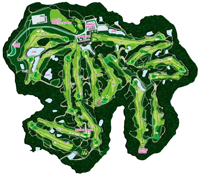 広大な敷地、起伏とバランス良く組み合わされている地形、敷地内に点在する大小の池、美しい樹木、澄み切った空気等、プレイの楽しさをひきだす自然条件を内包しています。