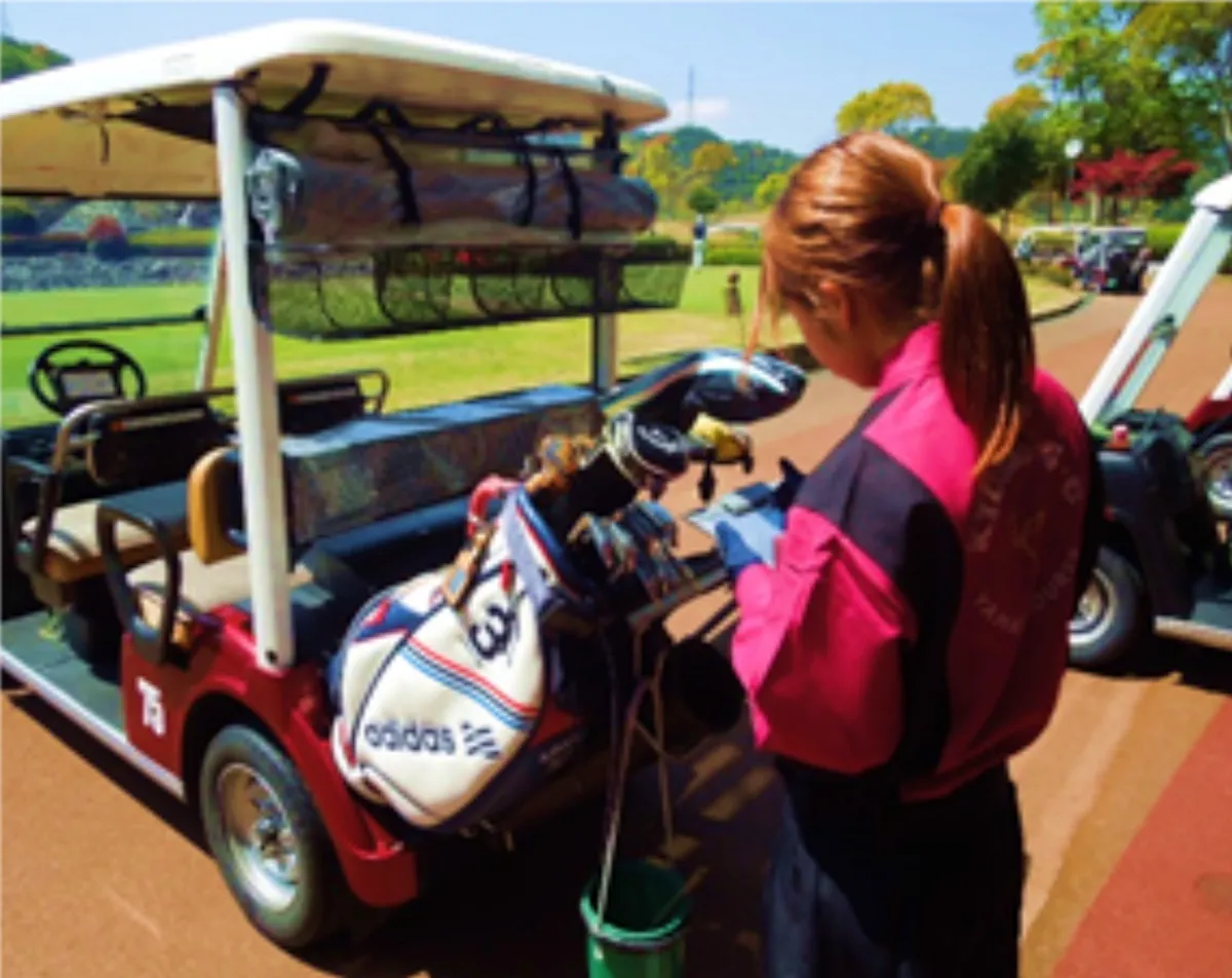 お客様の車からキャディバッグをお預かりして、ゴルフカートに積み込みます。